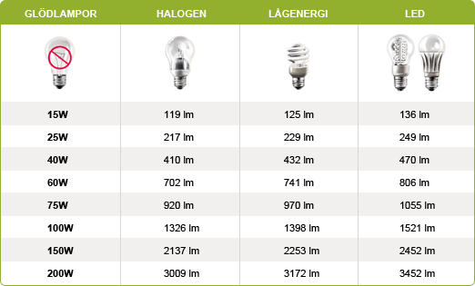 Watt är ett mått på hur stor elektrisk effekt som en lampa har. Eftersom vi nu måste jämföra olika nya alternativ till glödlampan är det viktigare att veta hur mycket ljus dessa ger. Enheten för detta är lumen. På lampförpackningarna ska därför från och med den 1 september 2010 användas enheten lumen. Tabellen nedan visar vilka lumen-tal för de olika alternativen motsvarar de traditionella glödlampornas ljusmängd.